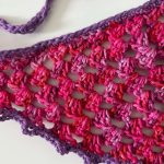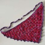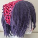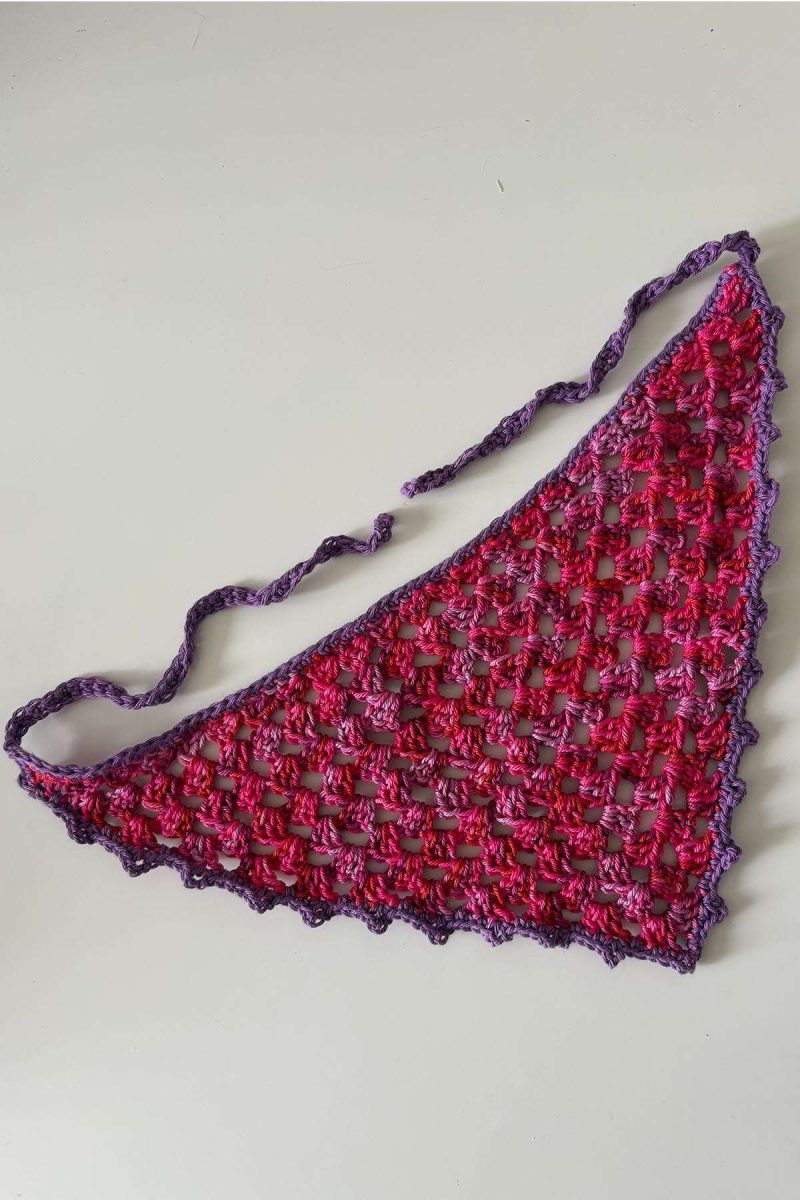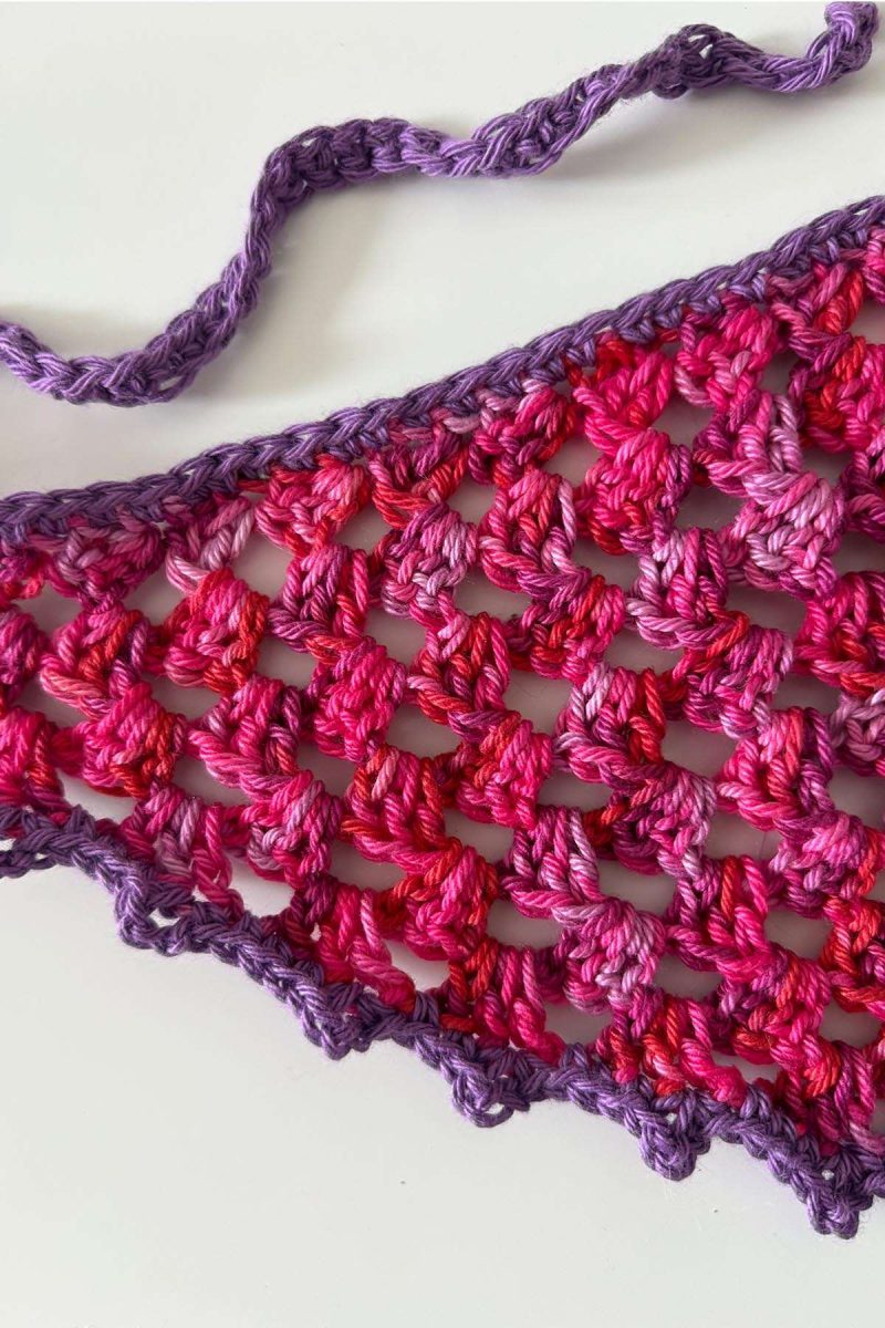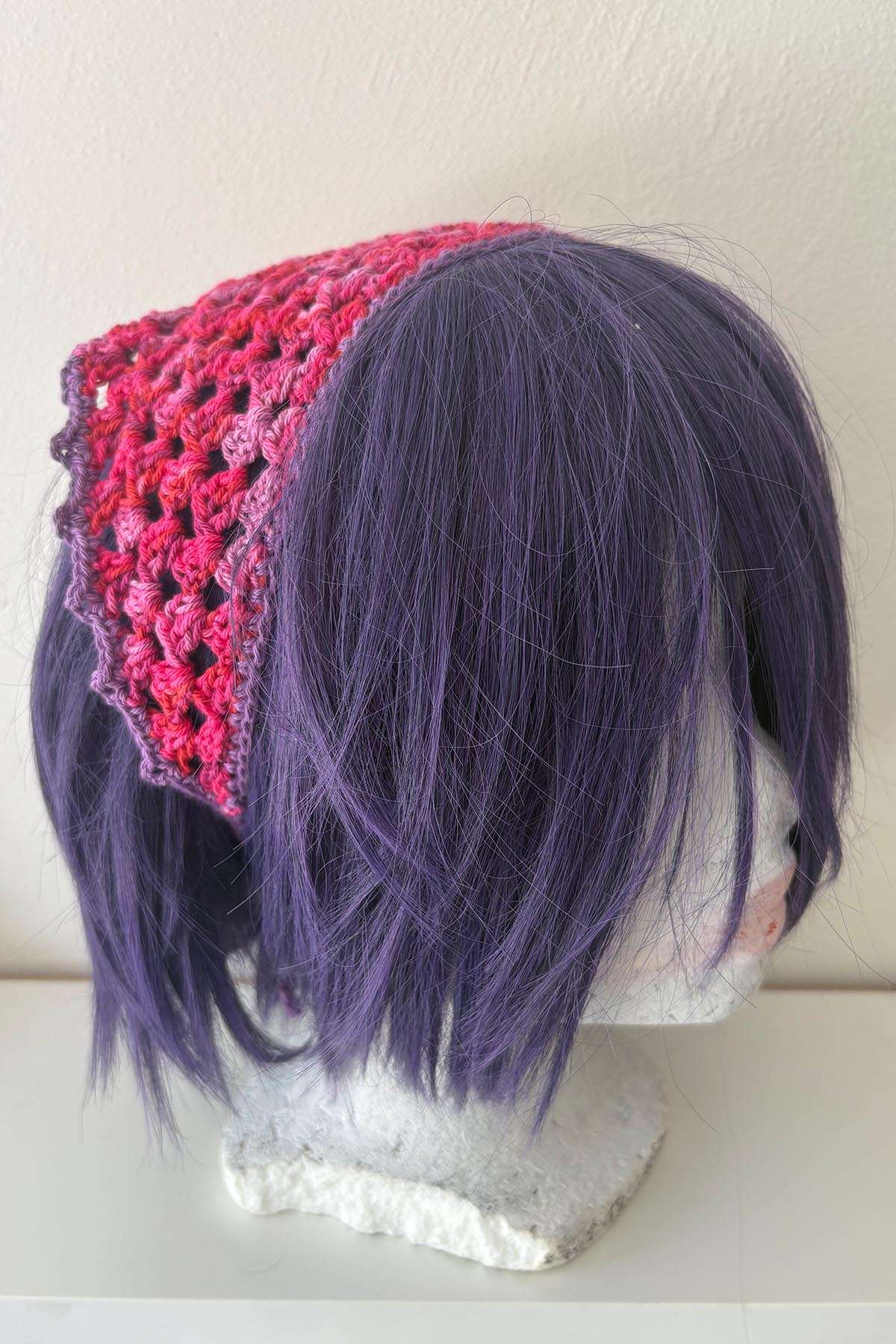 A Crochet bandana with a base of multiple variations of the colour red and with hints of purple and pink. With a purple border.