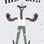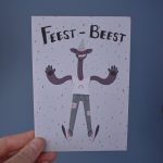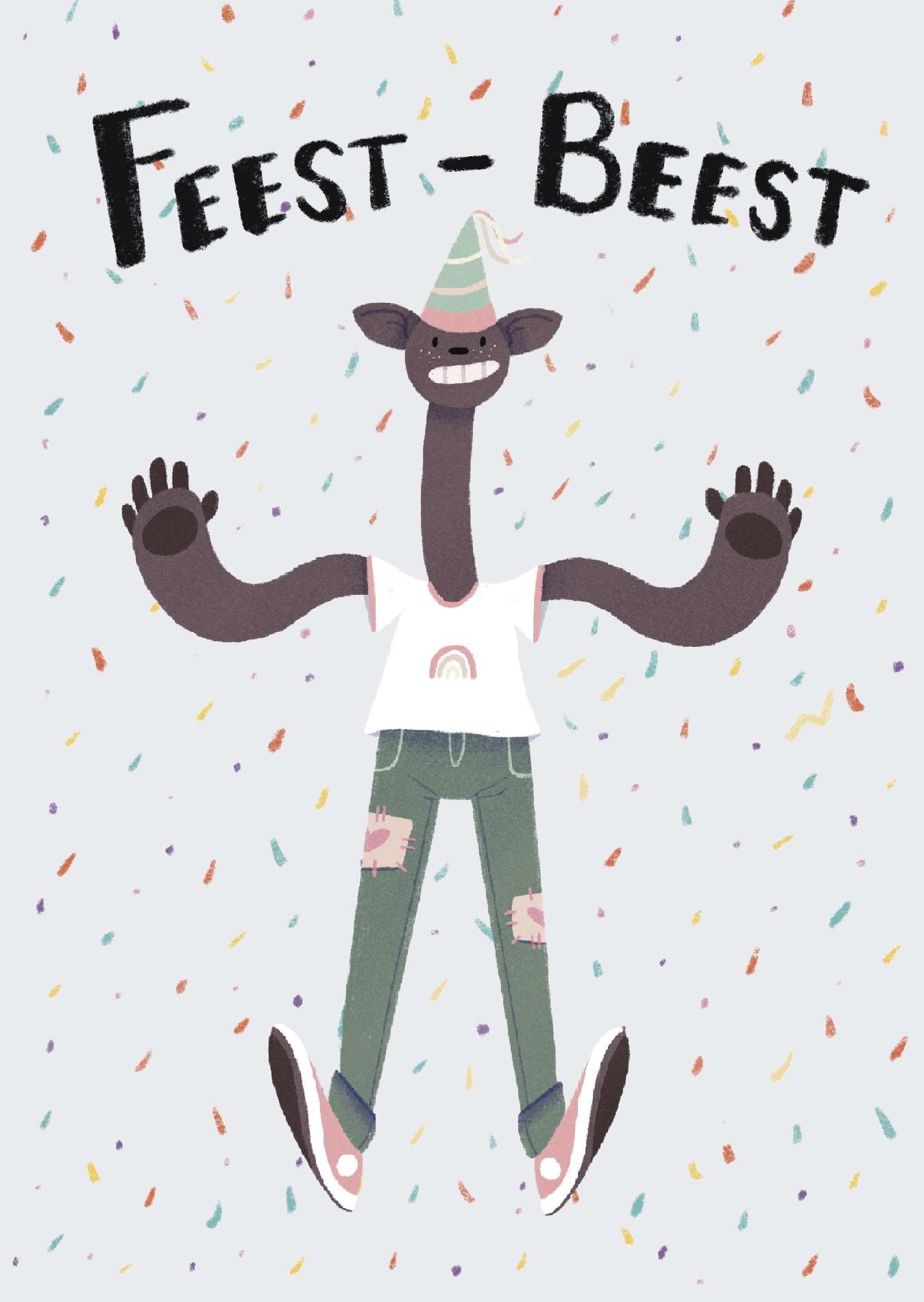 This fun and festive postcard features a cheerful “Feest-Beest” (Party Animal) character dancing with arms wide open, wearing a party hat and surrounded by colorful confetti. Perfect for birthdays, celebrations, or any joyous occasion, this card radiates playful energy and is guaranteed to spread smiles and party vibes!