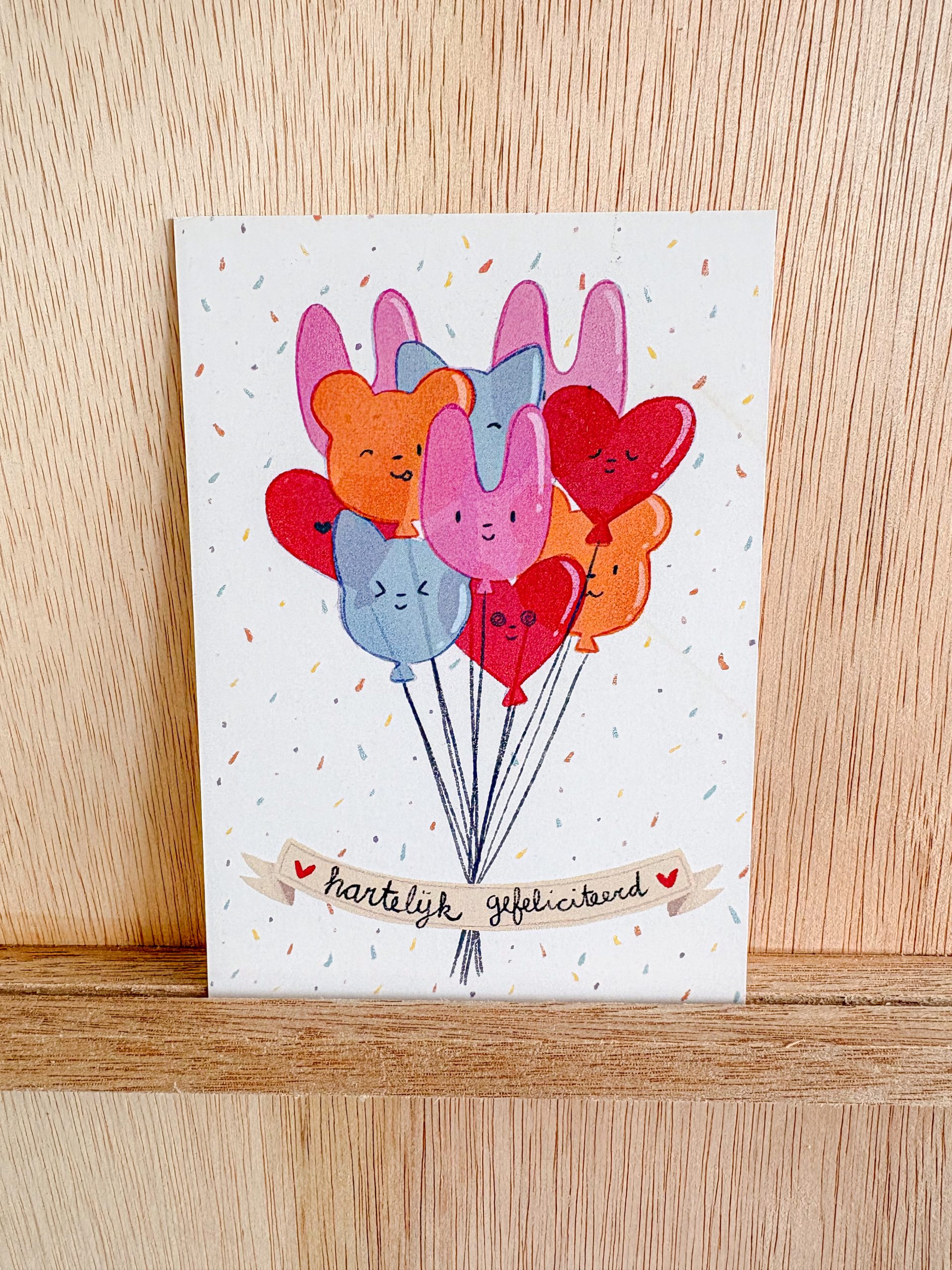 Celebrate life’s special moments with this cheerful postcard featuring a playful bundle of colorful balloons shaped like hearts, bunnies, and bears, set against a festive confetti background. The charming banner reading “Hartelijk Gefeliciteerd” (Dutch for “Congratulations”) makes it perfect for birthdays, milestones, or any occasion worth celebrating. A sweet and whimsical design sure to bring smiles and joy to the receiver.