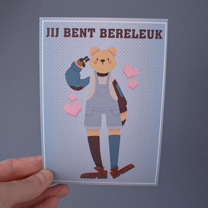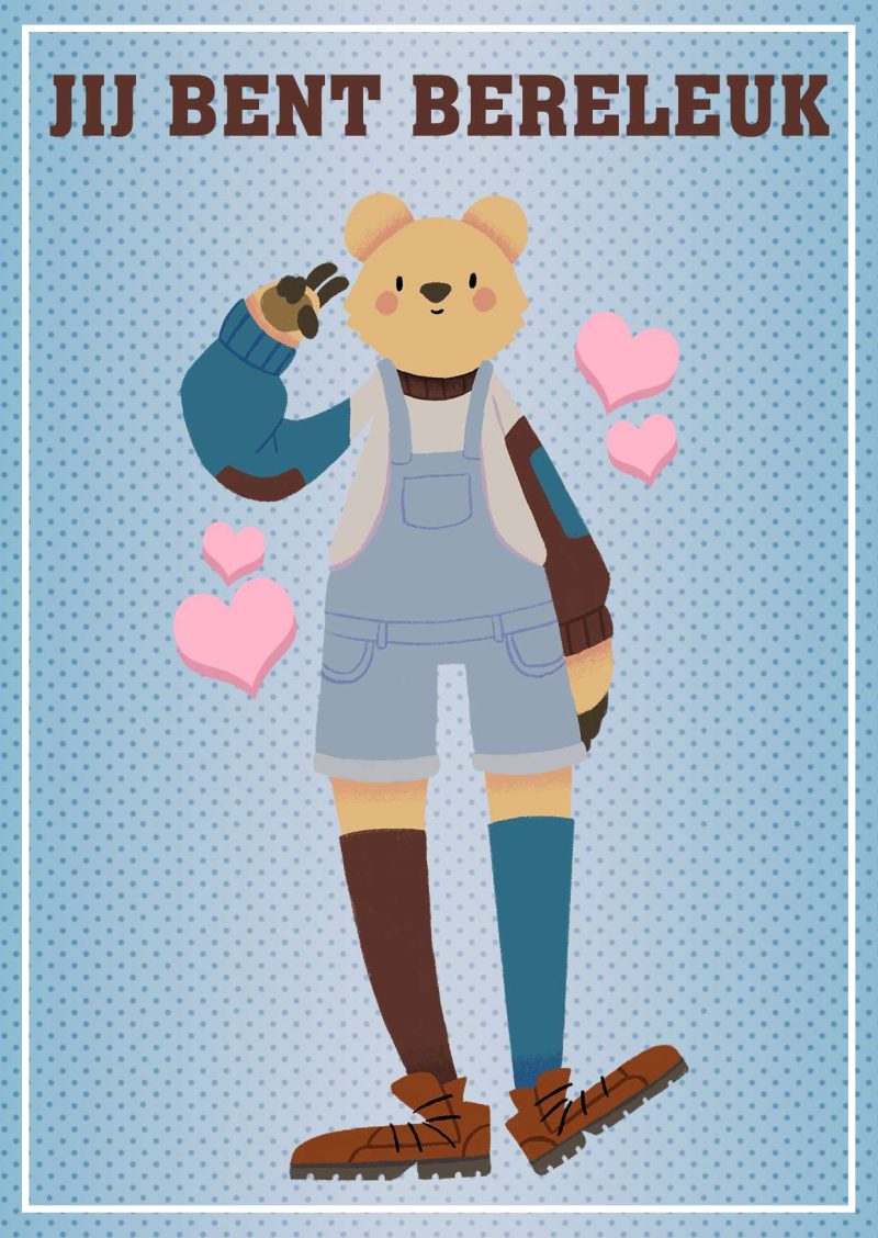 Celebrate someone’s awesomeness with this fun and uplifting postcard! Featuring an adorable bear character dressed in a playful outfit of overalls and mismatched sleeves, this design exudes personality and charm. Set against a cheerful blue polka-dot background, the message “Jij bent bereleuk” (You are ‘bear-y’ fun!) is a delightful pun sure to bring a smile to anyone’s face.