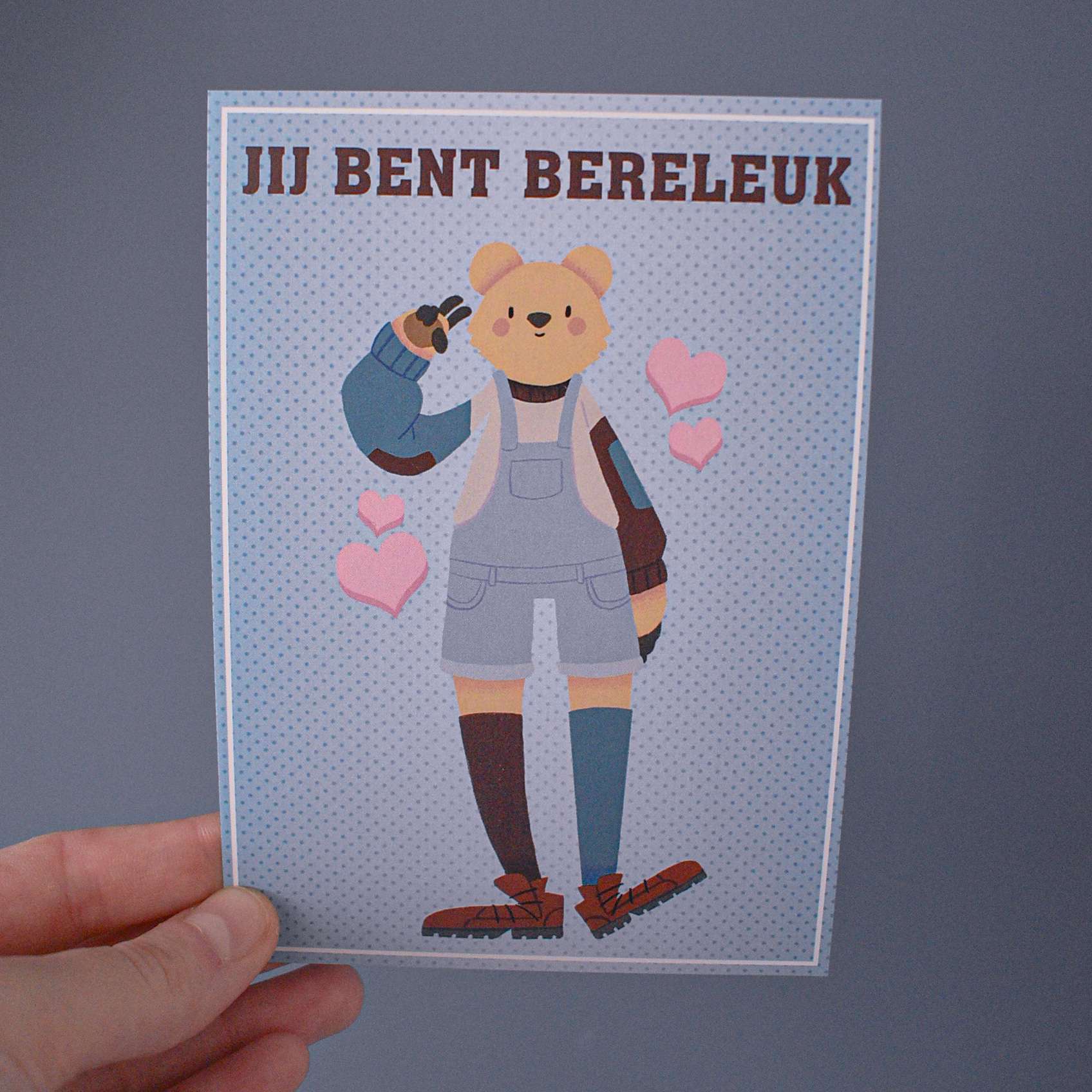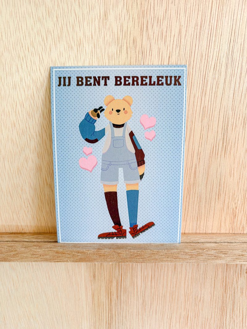 Celebrate someone’s awesomeness with this fun and uplifting postcard! Featuring an adorable bear character dressed in a playful outfit of overalls and mismatched sleeves, this design exudes personality and charm. Set against a cheerful blue polka-dot background, the message “Jij bent bereleuk” (You are ‘bear-y’ fun!) is a delightful pun sure to bring a smile to anyone’s face.
