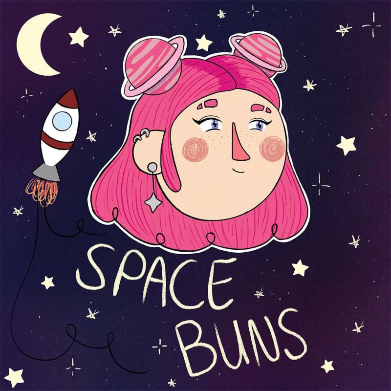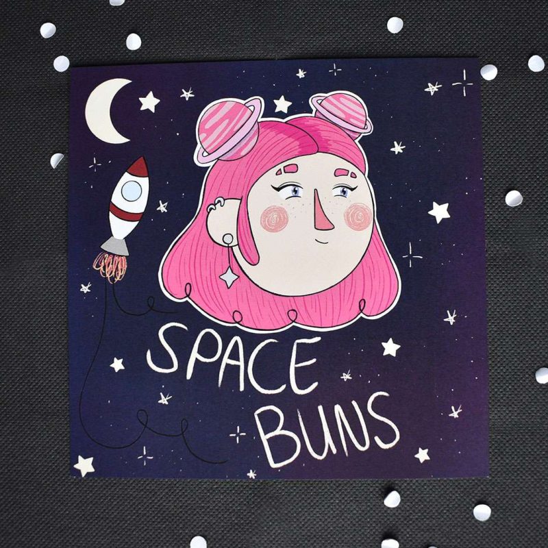Add a cosmic vibe to your space with this quirky art print featuring a whimsical character with pink hair styled as planet-shaped buns. Surrounded by a starry night sky, crescent moon, and a playful rocket, this design is a celebration of creativity, individuality, and intergalactic charm.
